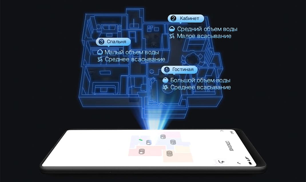- деление квартиры на комнаты с индивидуальной настройкой силы всасывания и смачивания для каждой из них;