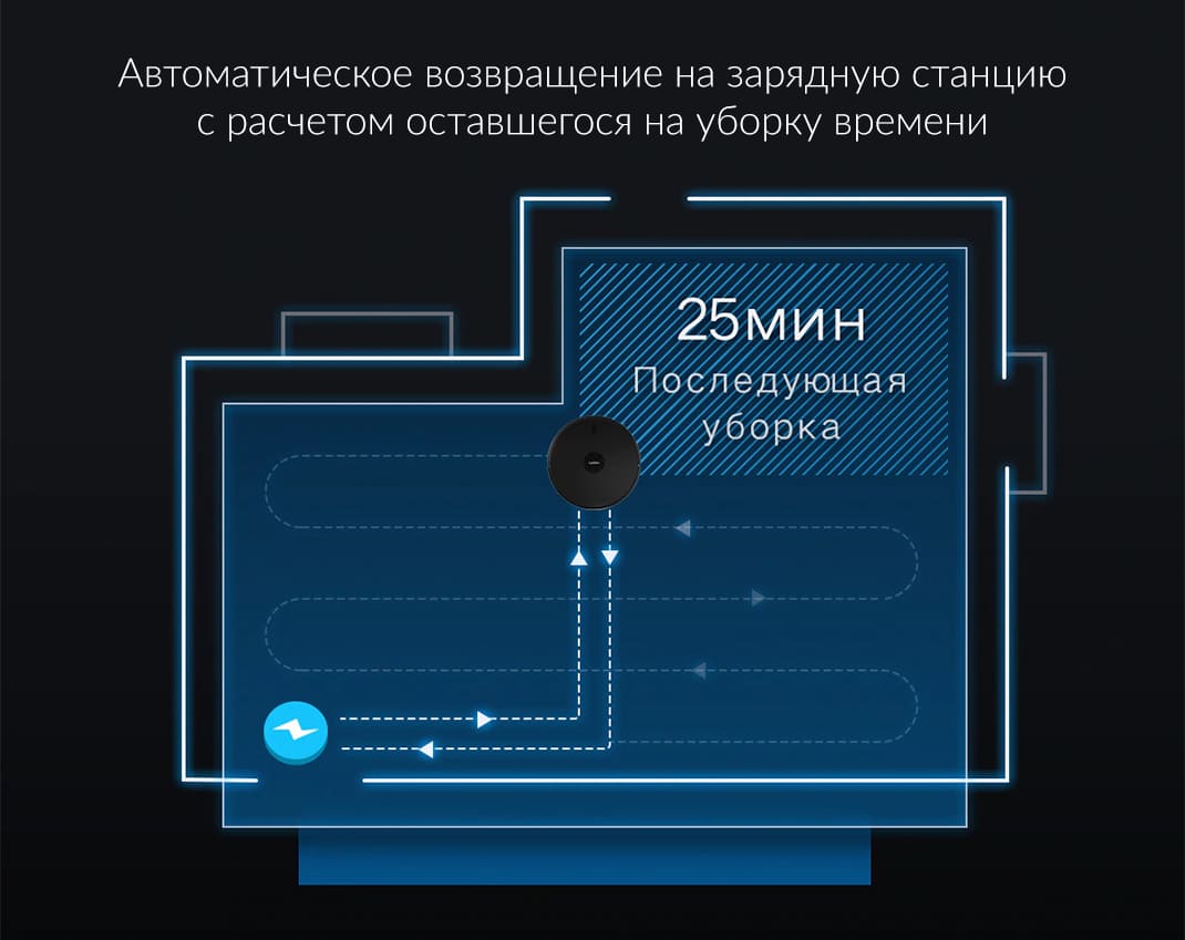 Емкость аккумулятора робота-пылесоса составляет 5200 мАч. При минимальном расходе заряда батареи время автономной работы может составлять 2.5 часа. Если аккумулятор будет разряжен, прибор вернется на зарядную станцию, а сразу после зарядки он продолжит уборку.