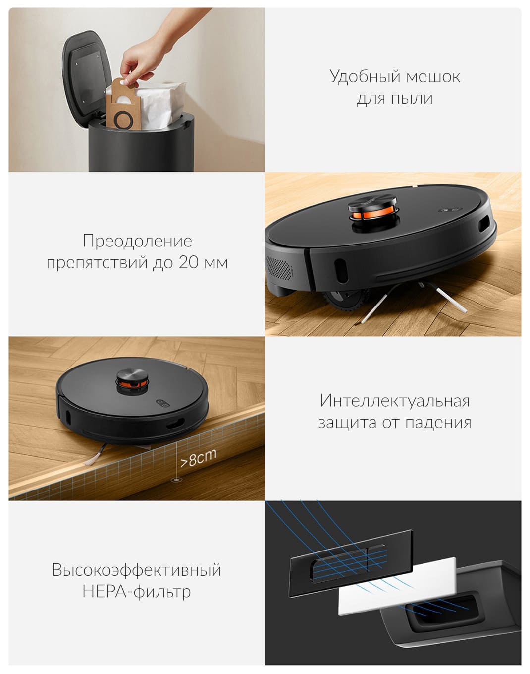 Благодаря радиолокационному лазерному датчику LDS 2.0 робот-пылесос Xiaomi Lydsto R1 Robot Vacuum Cleaner легко маневрирует между препятствиями, старается избегать столкновений, запоминает обработанные и необработанные участки. 2-ядерный процессор Quanzhi MR112 и множество датчиков позволяют устройству выполнять полностью безопасную очистку, обнаруживать ступеньки и избегать падения.